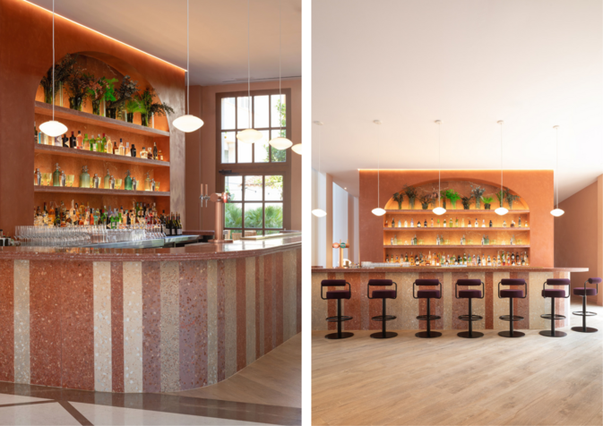 This can be seen from the terracotta arches to the sea-green terrazzo tables, and even the azure-tiled ceiling—a cohesive colour palette that moves gradually from land to water.
